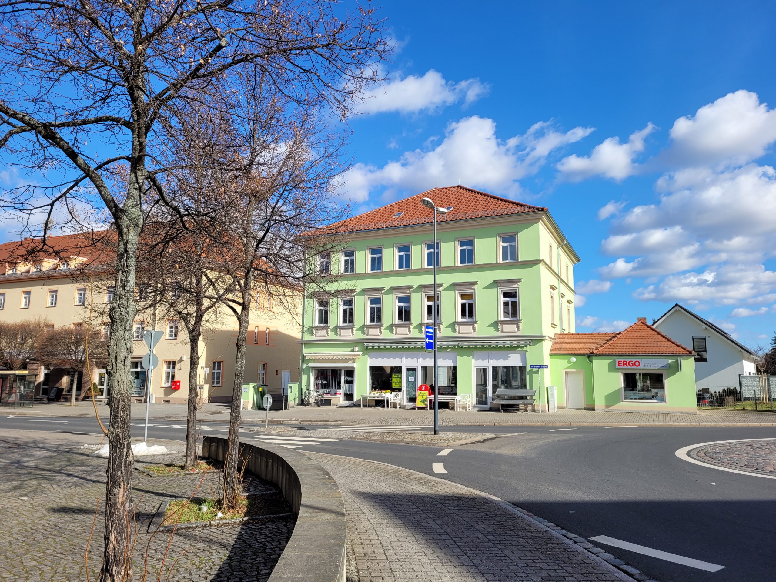 Das zentrale größere Geschäft liegt hier an der straßenseitigen Vorderfront zwischen einer Änderungsschneiderei und einem Versicherungsbüro in dem 1876 erbauten platzprägenden Miets- und Geschäftshaus, das 2020 mit Sorgfalt und Liebe nach den Vorgaben der EnEV saniert wurde.